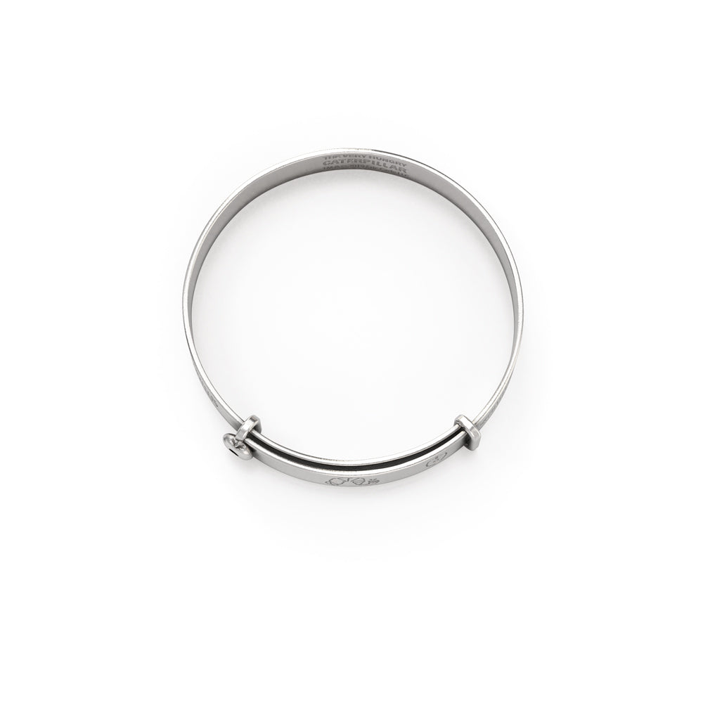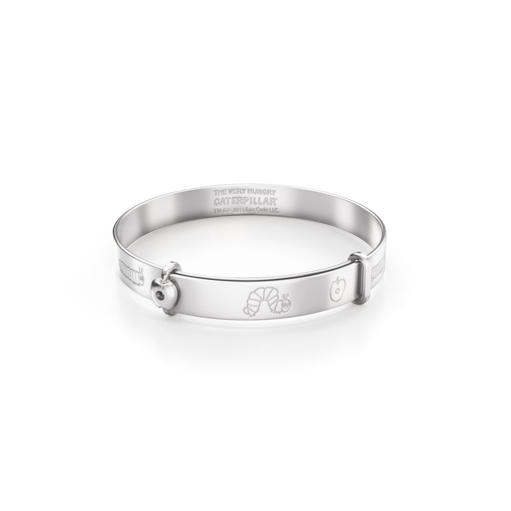 Celebrate life's precious moments with The Very Hungry Caterpillar Baby My First Bangle, a beautifully handcrafted sterling silver christening bracelet officially licensed by Eric Carle. This adorable keepsake is designed to capture the magic of the beloved children’s story, featuring delicate etchings of The Very Hungry Caterpillar alongside the apple and pear from the classic tale.