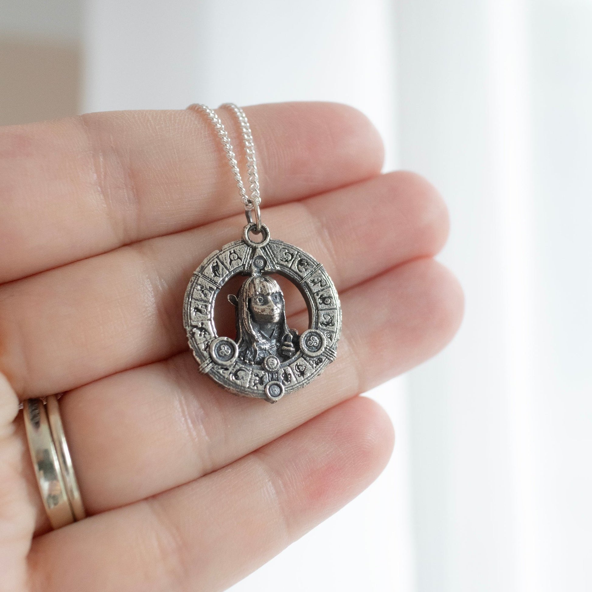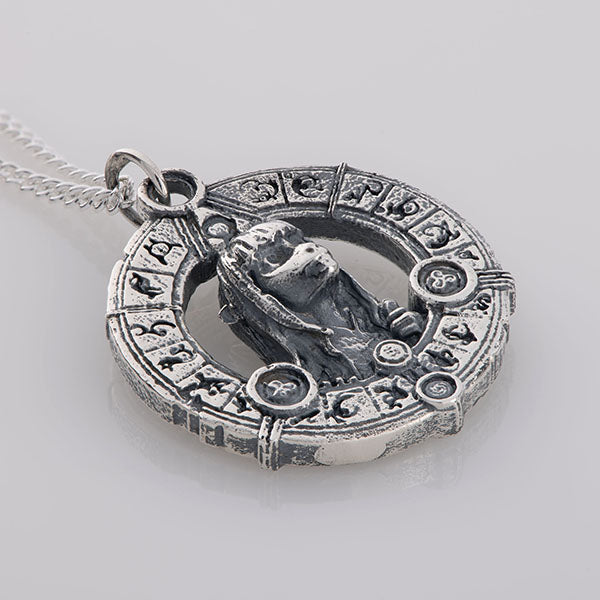 Embrace the dark enchantment of The Dark Crystal with the Jen Necklace, handcrafted recycled sterling silver. This exclusive pendant celebrates Jim Henson's epic and iconic fantasy adventure, capturing the essence of Jen the Gelfling. With his long, thick hair and clothing adorned with intricate urRu designs, Jen peers through a circle surrounded by mystical urRu symbols.