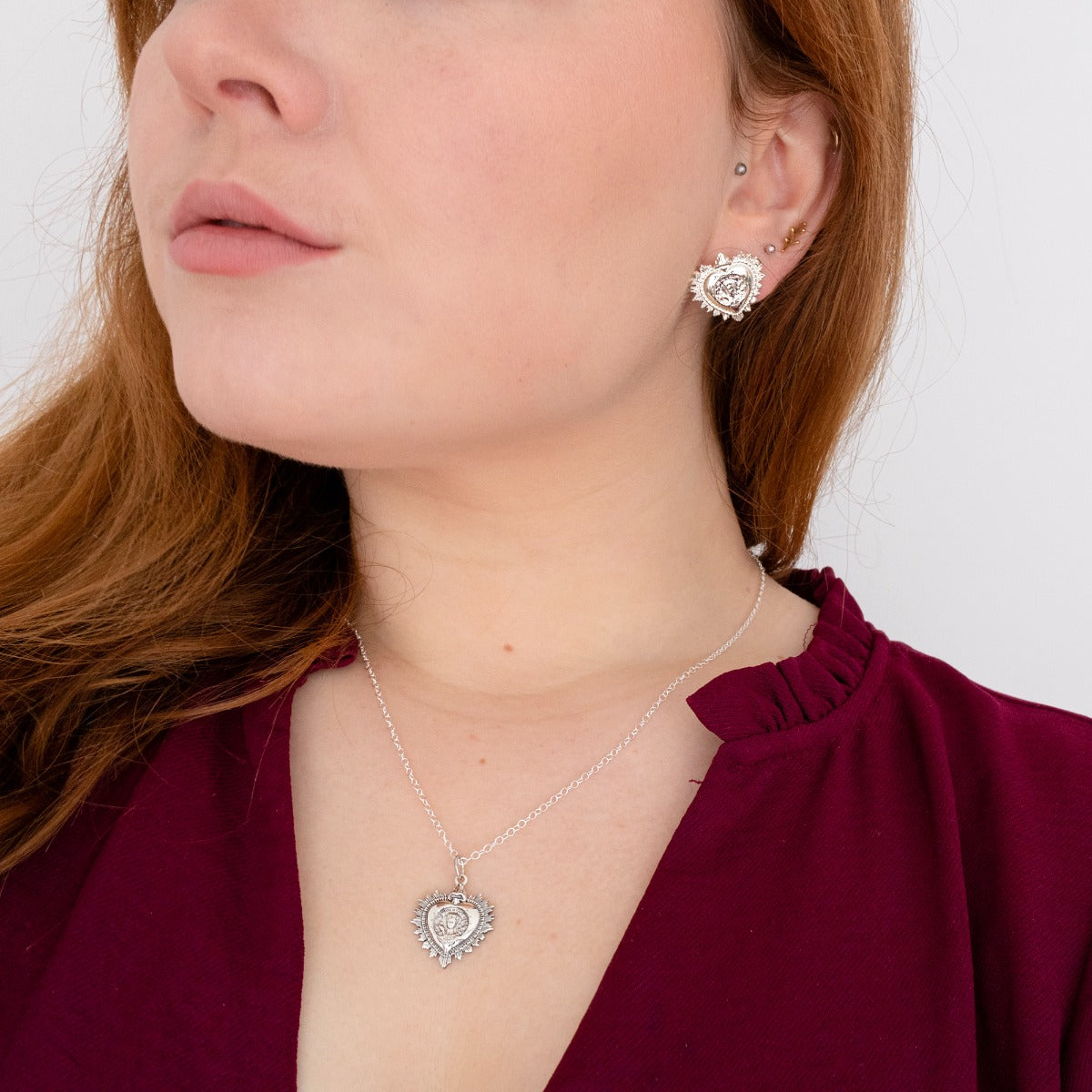 Handcrafted from recycled sterling silver, the earrings feature an intricate sacred heart design—a powerful motif in Mexican folk art. At the centre sits Frida Kahlo’s iconic face, framed by blooming flowers and a serene seated bird, capturing the essence of her enduring artistic and feminist legacy.