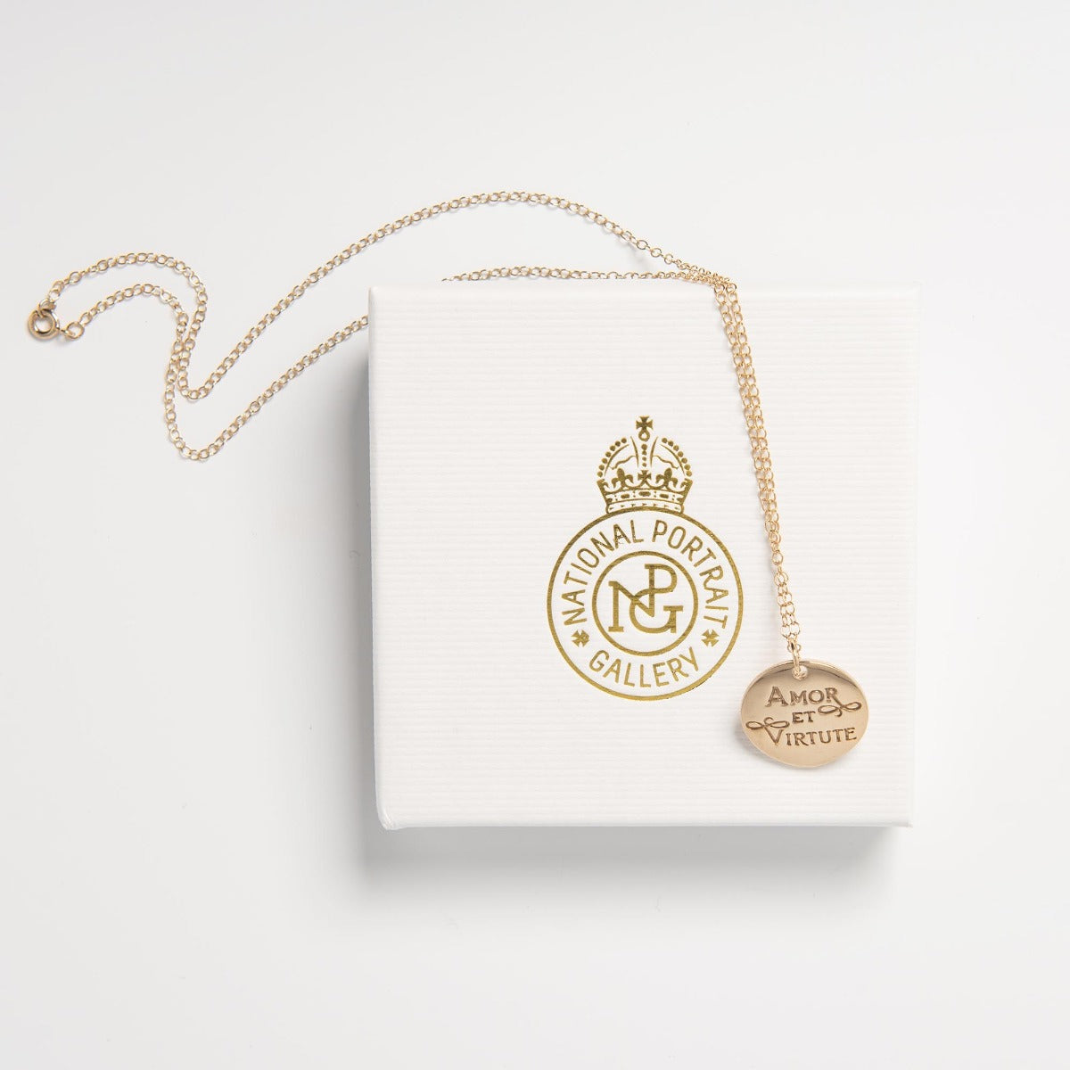 Embrace timeless elegance and historical symbolism with the Amor et Virtute Necklace in 18ct gold vermeil, part of the National Portrait Gallery Jewellery Collection. This refined pendant is inspired by the legacy of Sir Walter Ralegh, whose gallantry and intellect made him a revered figure in the court of Queen Elizabeth I.