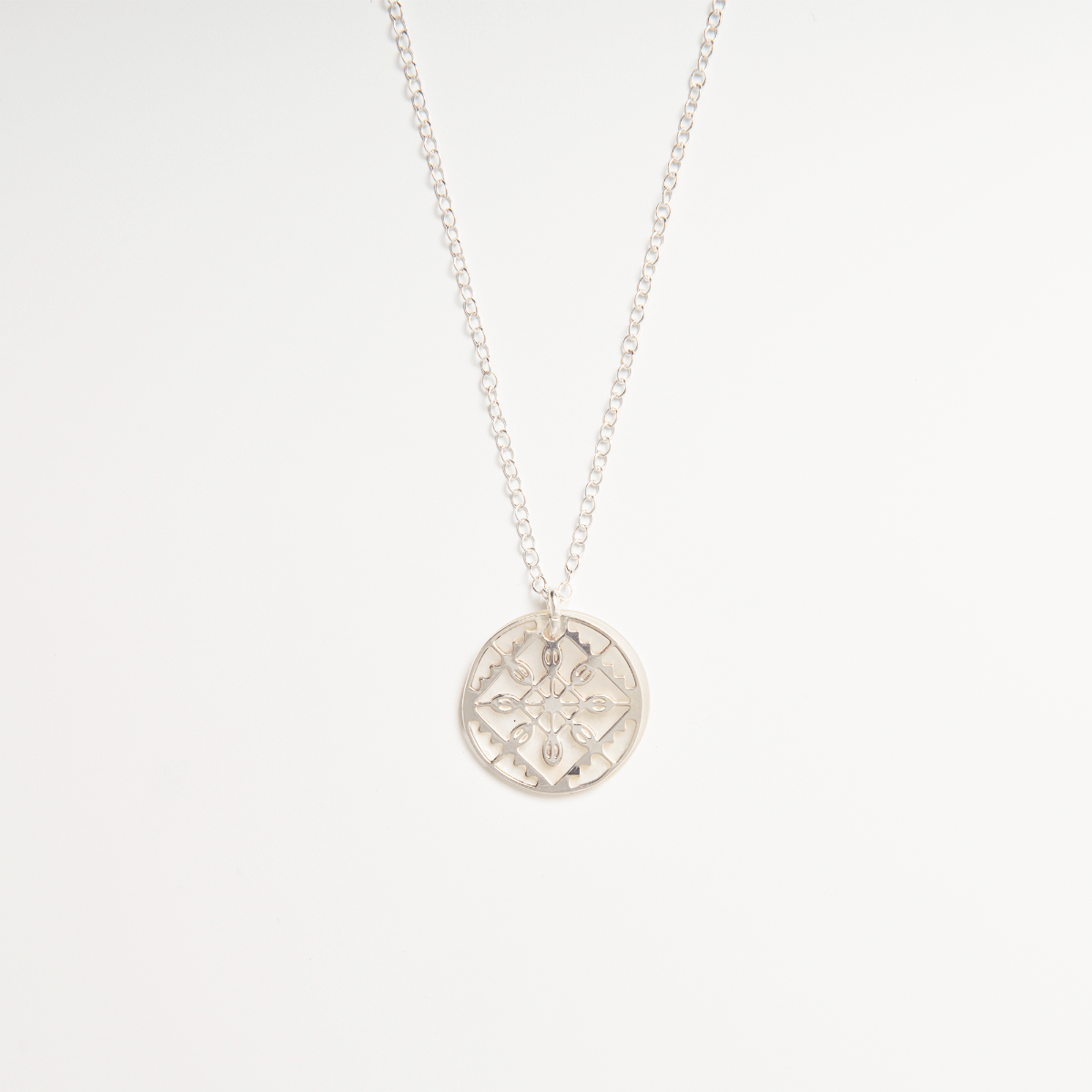 The top sterling silver disc is finely laser-etched with a lace motif, while the lower layer features iridescent mother-of-pearl, designed to move freely beneath, catching the light with every movement. This beautiful shimmer effect evokes the rich texture and layered detail of Elizabethan fashion, offering a graceful nod to the past in a thoroughly modern design.