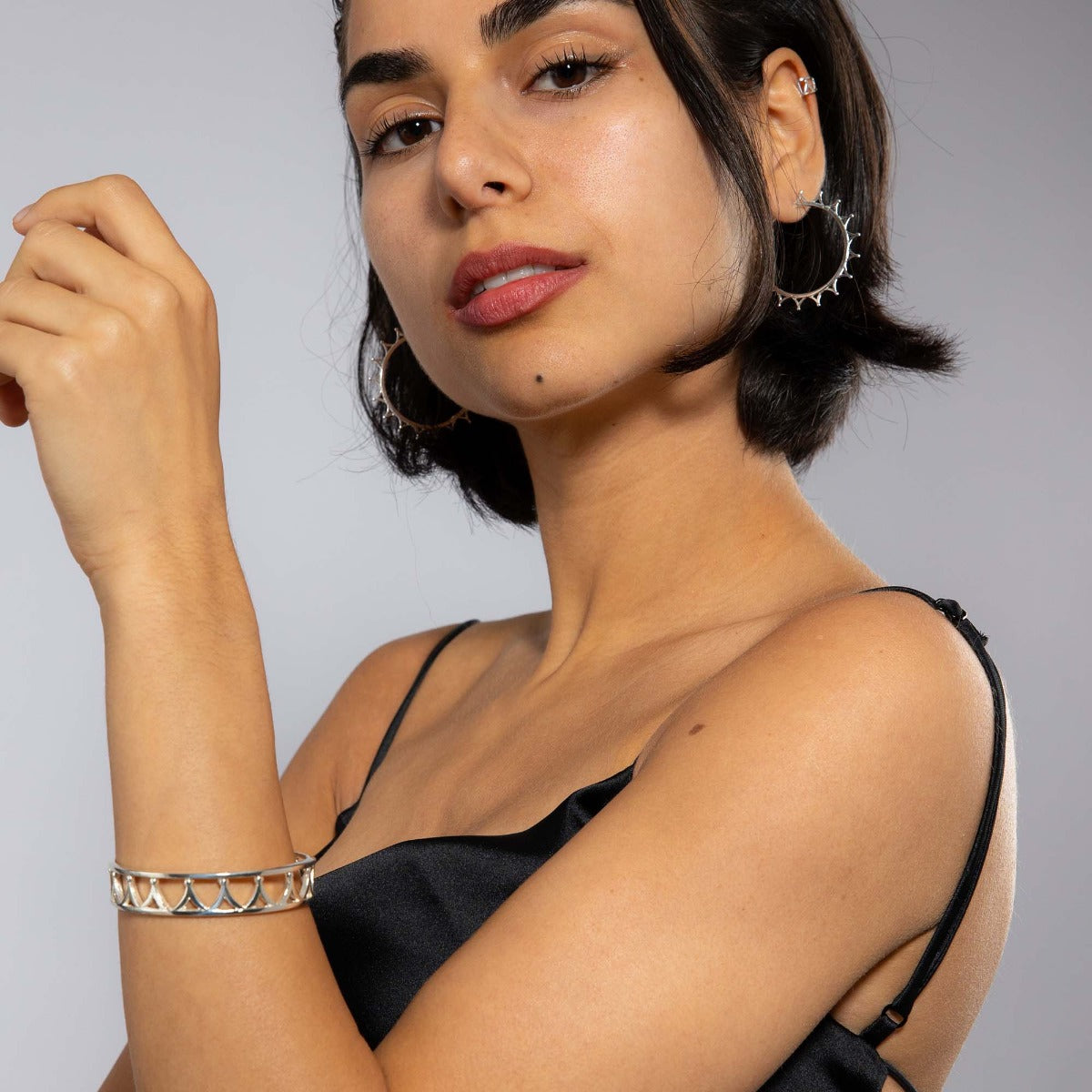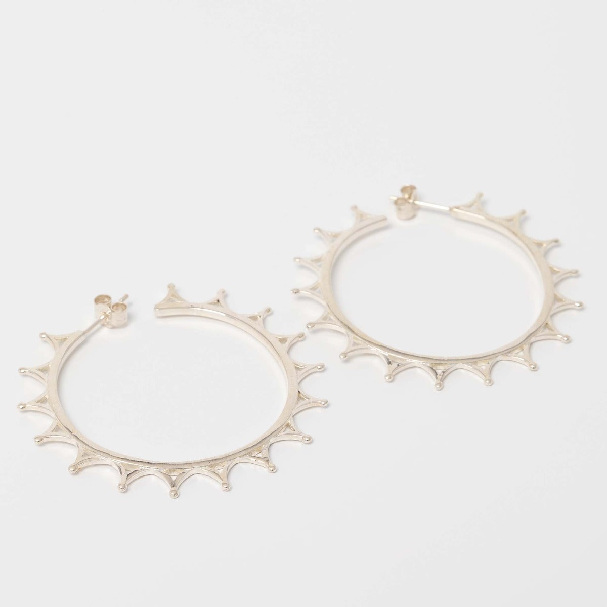 Each sterling silver hoop is intricately detailed with a delicate crown-inspired pattern, reflecting the diamond-encrusted swags and peaks of the legendary tiara. Handcrafted from recycled sterling silver, these earrings are lightweight, comfortable for everyday wear, and secured with push-back clasps.