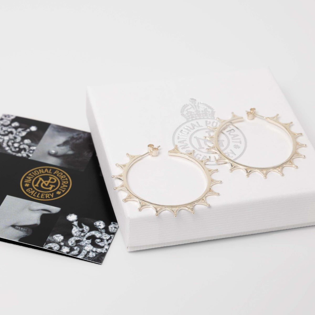 Celebrate timeless elegance with the Crown Hoop Earrings in Sterling Silver, part of the Jubilee Crown Collection in collaboration with the National Portrait Gallery. Inspired by the opulent design of Queen Elizabeth II’s favourite tiara, The Girls of Great Britain and Ireland, these earrings capture the regal beauty of the iconic headpiece.